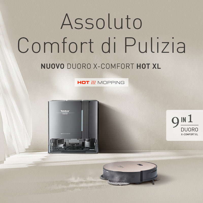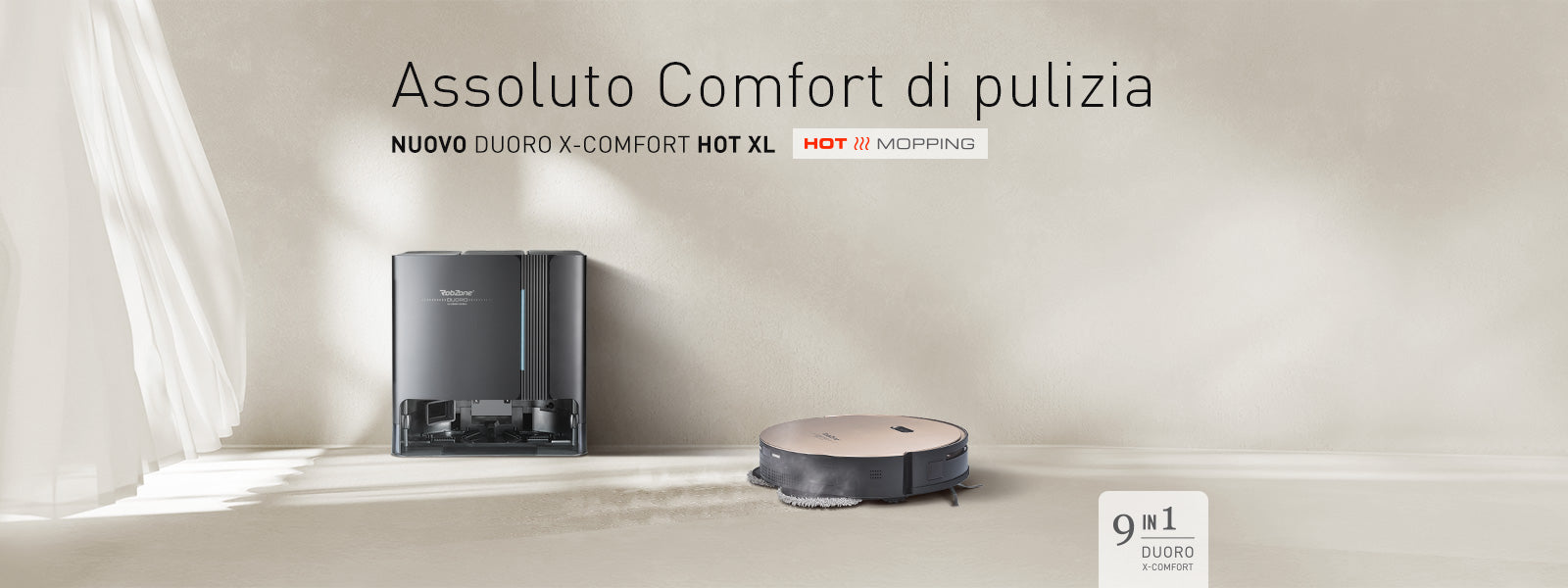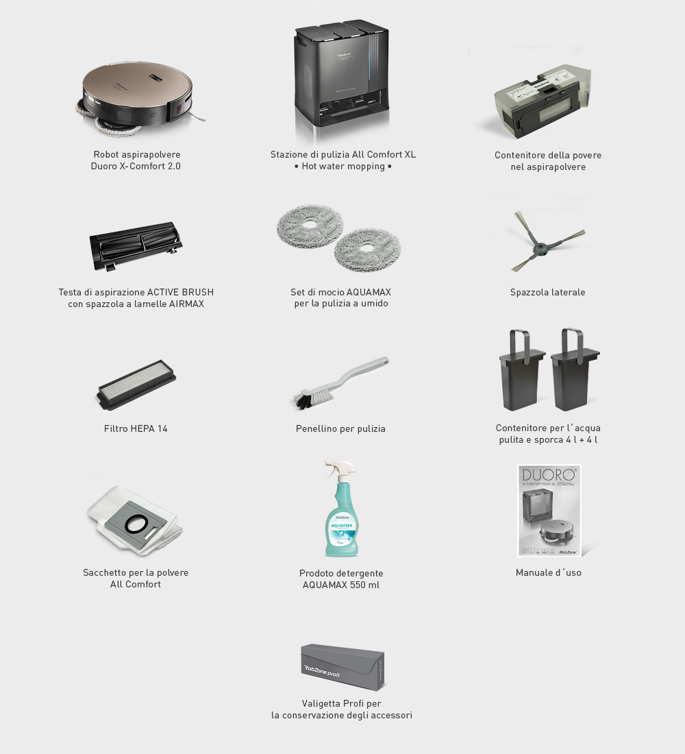 Robzone DUORO X-COMFORT 2.0 · Batteria Li-Ion 5200 mAh (installata nell'aspirapolvere) · Stazione di pulizia completamente automatica All Comfort XL/Hot water mopping · Cavo di alimentazione · Contenitore per rifiuti (installato nell'aspirapolvere) · Serbatoio dell'acqua (integrato) · Serbatoio per acqua pulita da 4 l (installato nella stazione) · Serbatoio per acqua sporca da 4 l (installato nella stazione) · Testa di aspirazione ACTIVE BRUSH con spazzola a lamelle AIRMAX (installata nell'aspirapolvere) · Set di panni AQUAMAX per lavaggio a umido · Spazzola laterale (1 pezzo, installata nell'aspirapolvere) · Filtro Hepa 14 (installato nell'aspirapolvere) · Sacchetto per la polvere All Comfort (installato nella stazione) · Spazzola per la pulizia