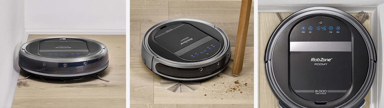 ROOMY SOLO è dotato di due spazzole laterali in fibre antistatiche, ideali per rimuovere la polvere fine dai pavimenti lisci. Pulisce accuratamente i cumuli di polvere lungo le pareti e negli angoli. Raggiunge perfettamente anche i punti difficili da pulire, come sotto il letto o sotto l'armadio, dove la polvere si accumula frequentemente. Ha un'altezza di soli 9 cm.