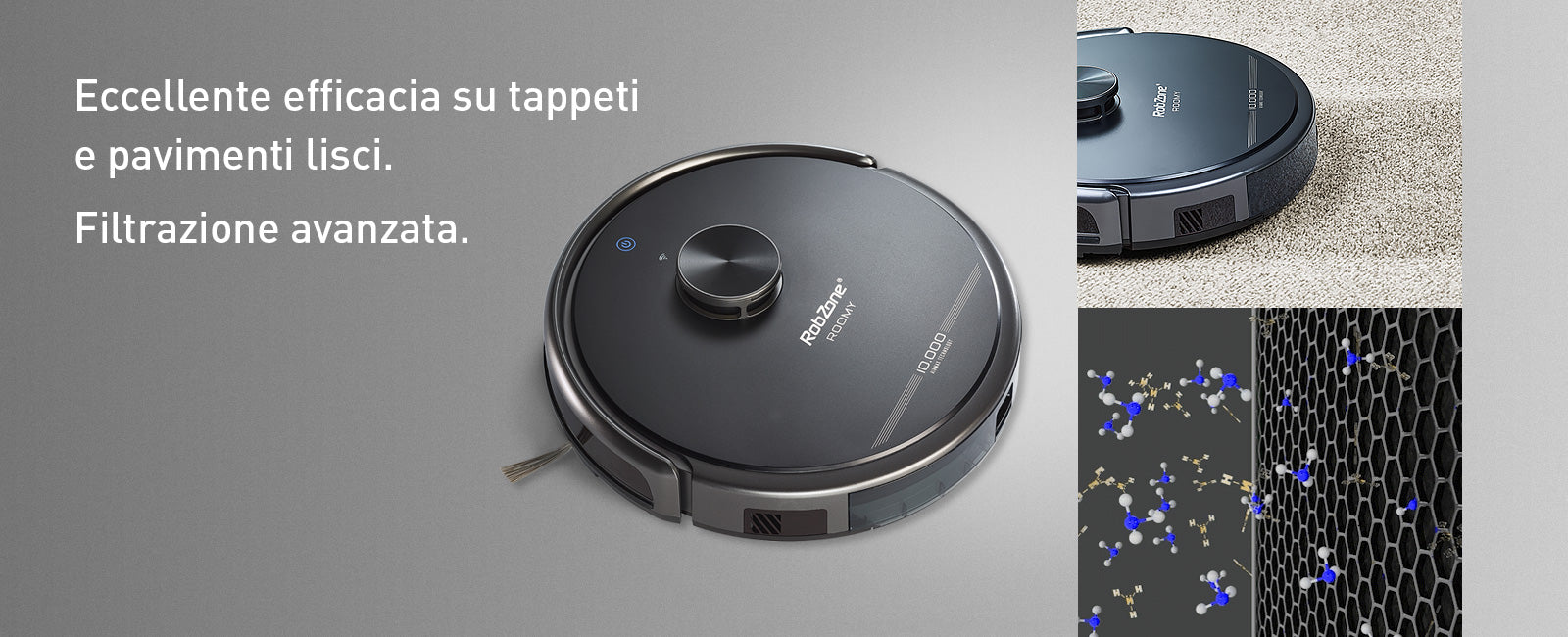 Roomy Supra è un potente robot aspirapolvere specializzato nella pulizia approfondita di tappeti e pavimenti lisci. Grazie alla funzione intelligente Boost Effect, riconosce immediatamente un tappeto sporco e avvia automaticamente l’aspirazione turbo profonda. Per i pavimenti lisci, è dotato di un sistema speciale Anti-Dust che, con una spazzola specifica combinata con la filtrazione Nano Air, elimina fino al 99,97% della polvere più fine. Non gli sfuggono nemmeno i cumuli di polvere negli angoli e lungo i bordi delle pareti.