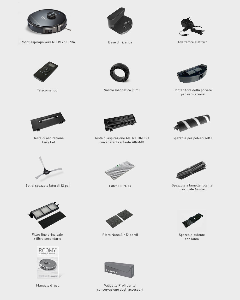 ROOMY SUPRA PROFI il robot aspirapolvere premium con aspirazione turbo profonda e massima attenzione alla pulizia salutare. Svuotamento automatico dello sporco dopo ogni utilizzo. Filtrazione al carbone super efficace con nano argento e filtro HEPA 14. Sistema Anti-Dust unico contro la polvere fine dannosa. Consigliato non solo per chi soffre di allergie. Roomy Supra offre le tecnologie più avanzate e un elegante design antracite.