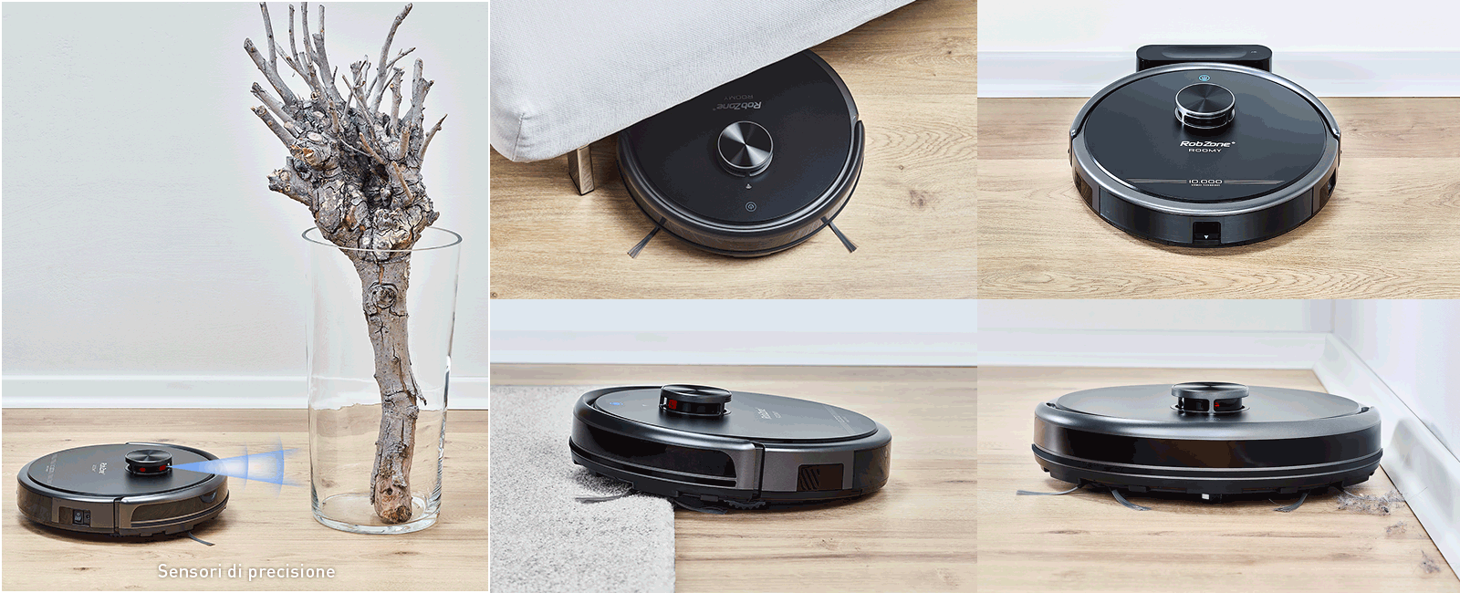 Roomy Supra, grazie alla precisa navigazione laser, mappa l'intero spazio domestico. Disegna una mappa completa, inclusa di tutti gli ostacoli, direttamente nell'applicazione. I sensori IR precisi gli permettono di muoversi agilmente anche in ambienti complessi o di destreggiarsi tra le gambe delle sedie senza alcuna esitazione.